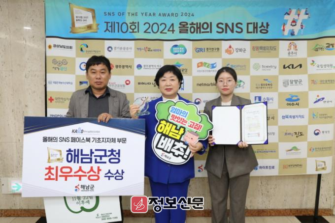 해남군은 21일 (사)한국소셜콘텐츠진흥협회가 주최하는 2024 올해의 SNS대상 페이스북 기초지자체 최우수상을 수상했다. 올해의 SNS 대상은 매년 SNS 운영 현황을 종합적으로 평가해 시민들과 활발히 소통한 기관에 수여하는 국내 최고 권위의 상이다.