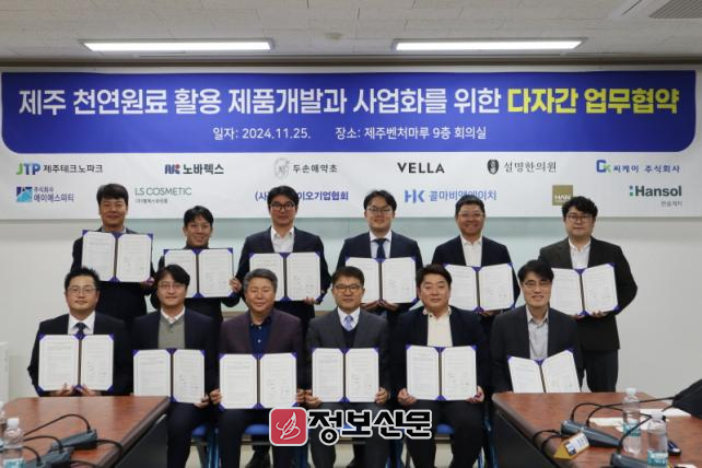 제주TP는 25일 오후 4시 제주벤처마루에서 ㈜노바렉스 및 ㈔제주바이오기업협회를 비롯해 국내 건강기능식품과 화장품, 한의원 및 완제품 유통, 친환경 포장 전문 혁신기업 11곳과 ‘제주 천연원료 활용 제품개발과 사업화를 위한 다자간 업무협약’을 체결했다고 26일 밝혔다.