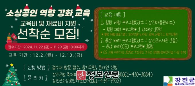 자세한 사항은 강진군 축제마케팅추진단 소상공인 역량강화 교육 담당자(061-430-3084)에게 문의하면 된다.