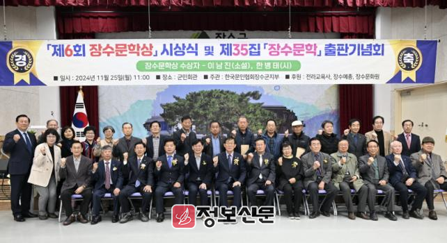 이번 행사는 장수문학상 운영 경과보고, 이명희 운영위원장의 심사평, 산문 및 운문 부문 시상식 순으로 진행됐으며, 제6회 장수문학상은 산문 부문에 소설가 이남진, 운문 부문에 시인이자 장수문화원장인 한병태 회원에게 수여됐다.