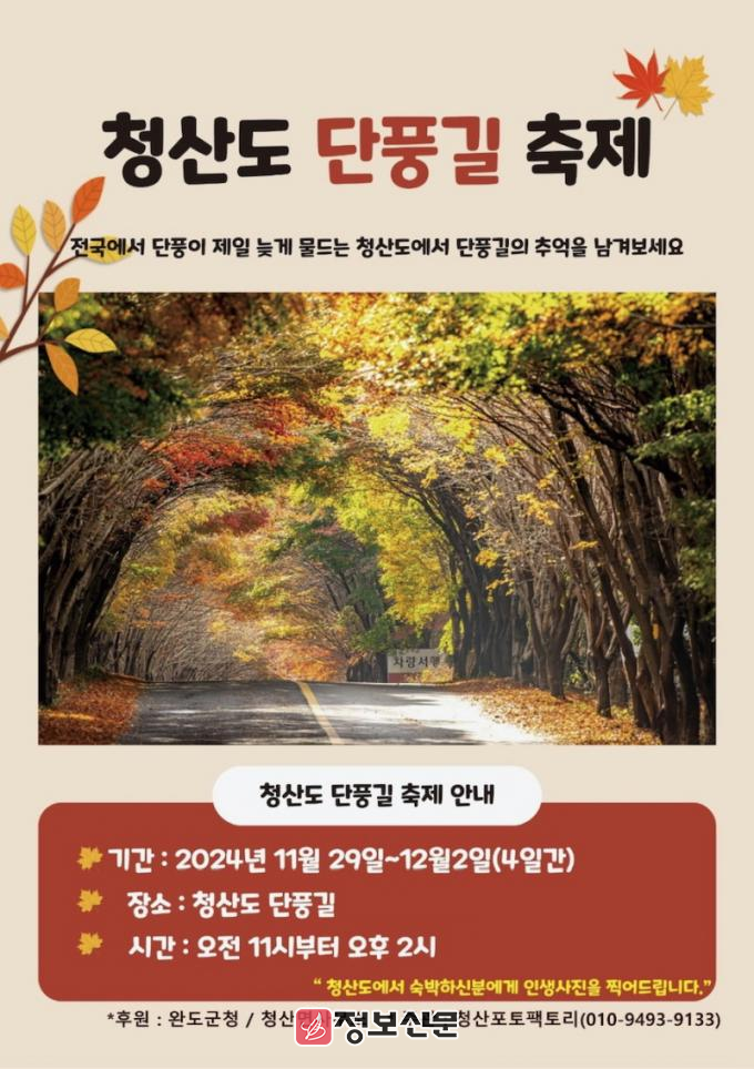 청산면사무소 관계자는 “청산도 단풍길 축제는 주민들이 만들어가는 행사로 청산도의 푸른 산과 바다가 어우러지는 멋진 경관과 늦가을 정취를 만끽해보시길 바란다”라고 말했다.
