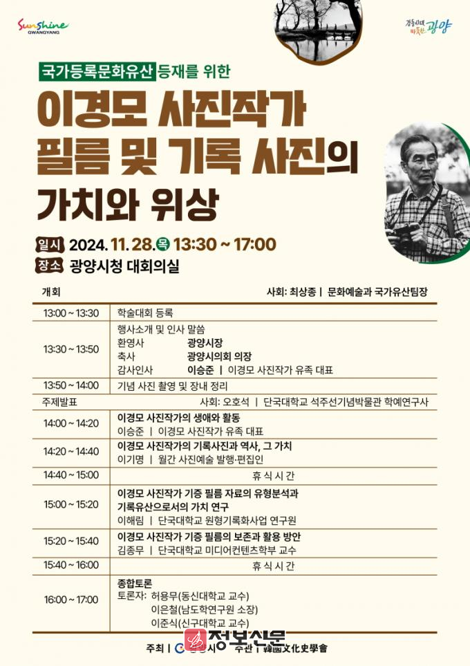 ![]() 광양시, ‘이경모 사진작가 필름 및 기록 사진의 가치와 위상’ 주제로 학술대회 개최 |