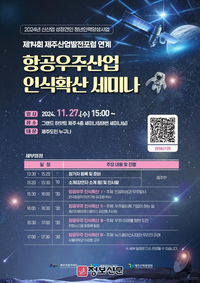 이번 세미나는 도내 청년들을 비롯해 항공우주산업에 관심 있는 도민 누구나 참여가 가능하며, 사전 등록은 홍보 포스터 QR코드를 통해 받고 있다.