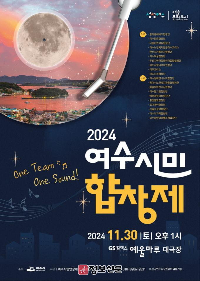 개막식에는 정기명 시장과 백인숙 여수시의회 의장, 주철현·조계원 국회의원 등이 참석해 축사와 격려사를 전하고, 4개 합창단과 ‘여수항경치’ 연합합창으로 시민과 함께 만드는 무대를 선보일 계획이다.