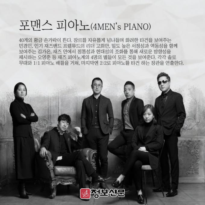 2회차 공연의 주인공인 포맨스 피아노(4Men’s Piano)는 국내 최정상급 피아니스트 4인으로 구성된‘누구도 흉내 낼 수 없는 건반 위 황금 손가락’이라고 불리는 재즈 피아노 그룹으로, 이번 공연에서 멤버 간 화려한 피아노 배틀로 ‘Spain’, ‘Shape of My Heart’, ‘The Girl from Ipanema’ 등의 명곡을 피아노 앙상블로 재해석할 예정이다.