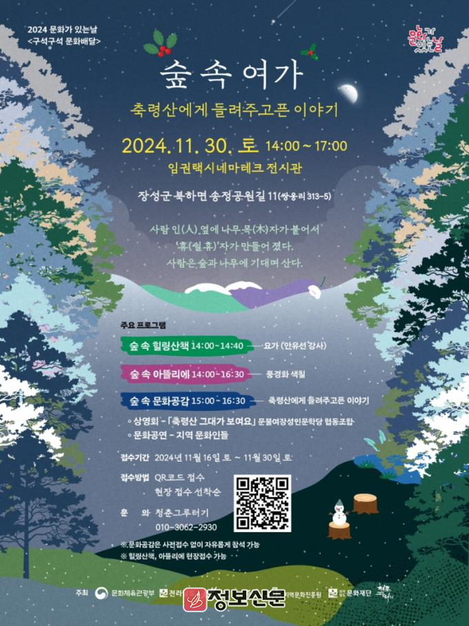 ![]() 장성군, “11월 마지막 주말 ‘숲속여가’ 오세요” |