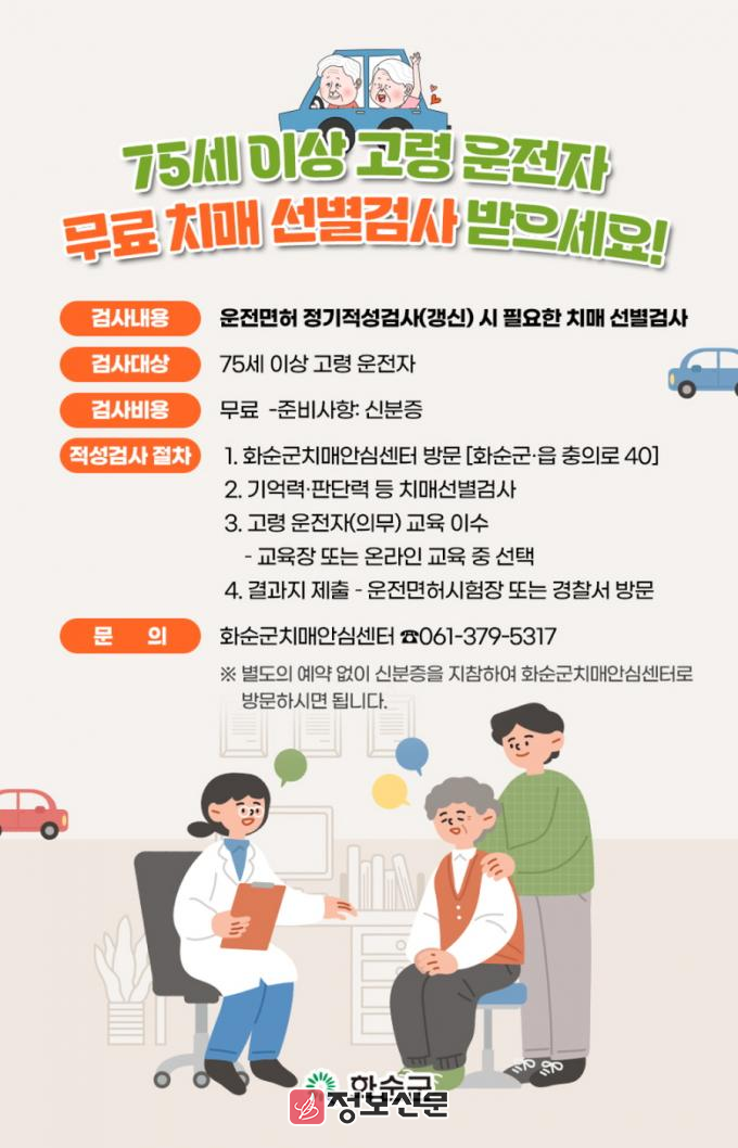 ![]() 화순군, 고령 운전자 치매선별검사 무료 지원사업 추진 |