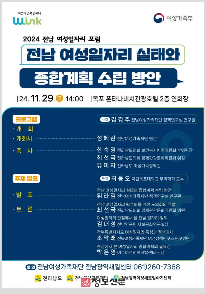 이번 포럼에서는 전남여성가족재단 위라겸 연구원이‘2024년 전남 여성일자리 종합계획 수립 방안’을 발표하고, 최동오 목포대학교 무역학과 교수가 좌장을 맡아 전문가 지정토론이 진행된다.