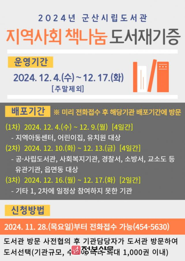 ![]() 군산시립도서관, 2024년 지역사회 책나눔 도서재기증 운동 전개 |