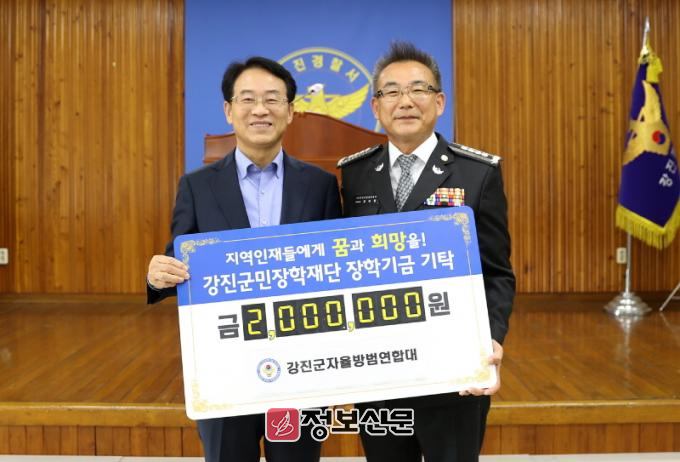 27일 강진군에 따르면 지난 16일 강진경찰서 3층 어울마당에서 열린 강진군 자율방범연합대 방범의 날 기념식 및 가족한마음대회 행사를 맞아 김태형 연합대장이 장학금 200만 원을 강진군민장학재단에 기탁했다.