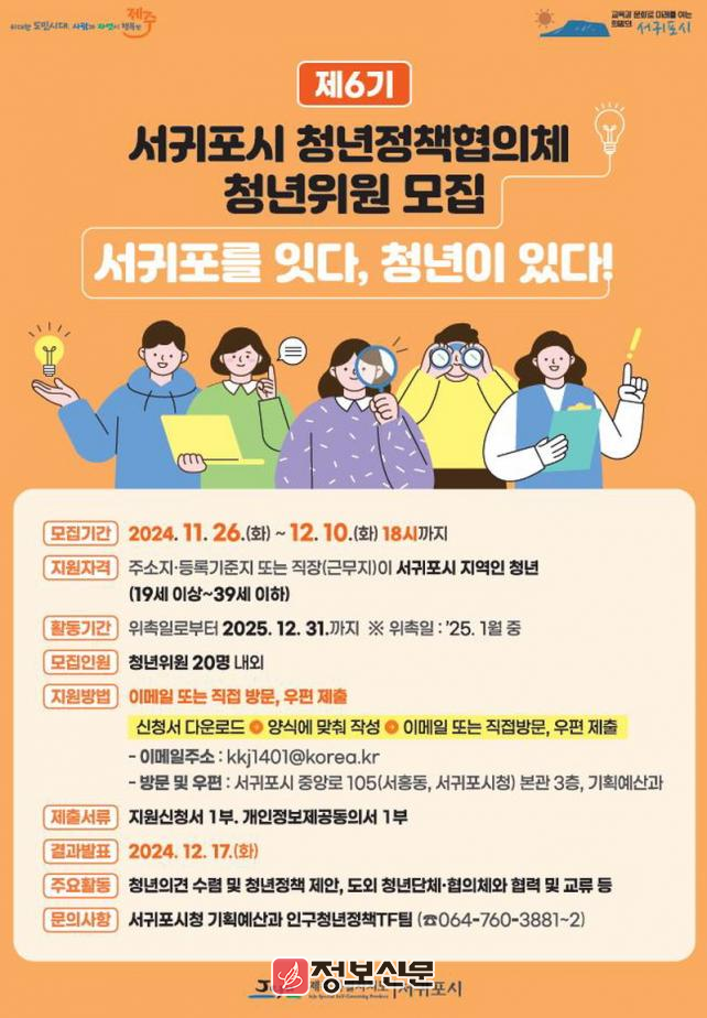 ![]() 서귀포시, 제6기 청년정책협의체 위원 모집 |