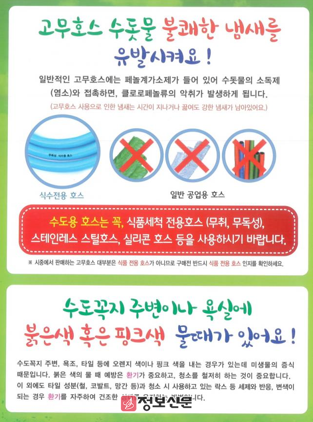 이에 따라 시는 음용이나 조리용으로 사용하는 수도에는 고무호스를 연결하지 않도록 주의하고, 부득이 고무호스를 사용할 경우에는 무취·무독성의 수도용 식수전용 고무호스 또는 실리콘 호스 등을 사용해줄 것을 당부했다.