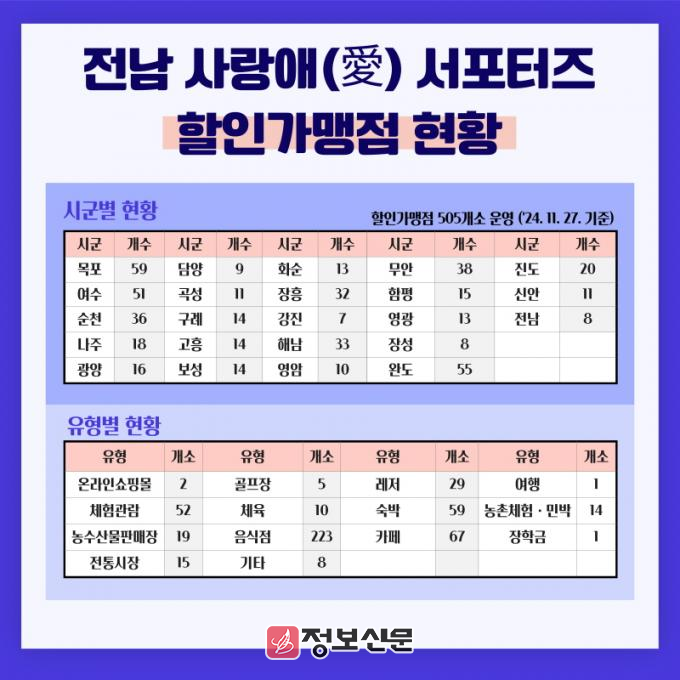 현재 전남 사랑애 서포터즈 할인가맹점은 목포 59개소, 완도 55개소, 여수 51개소 등 지역별로 고르게 분포해 있다. 업종별로는 음식점 223개소, 카페 67개소, 숙박 59개소, 체험·관람 52개소, 전통시장 15개소 등으로 전남의 필수 여행지와 대표 음식점을 포함하고 있다.