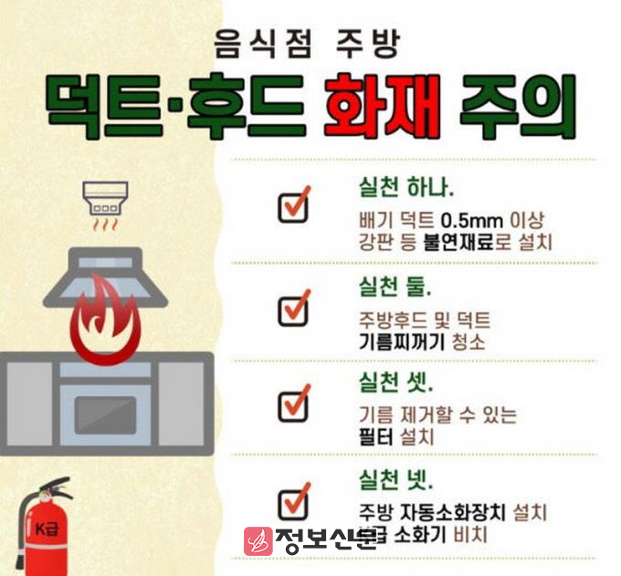 이를 예방하기 위해서는 ▲벽과 후드·덕트의 주기적인 청소를 통한 기름때 제거▲화기 주변 인화성 물질 두지 않기▲주방용 소화기(K급) 비치▲기름을 제거할 수 있는 필터 설치▲주기적인 환기 및 환기기구 정비 등이다.
