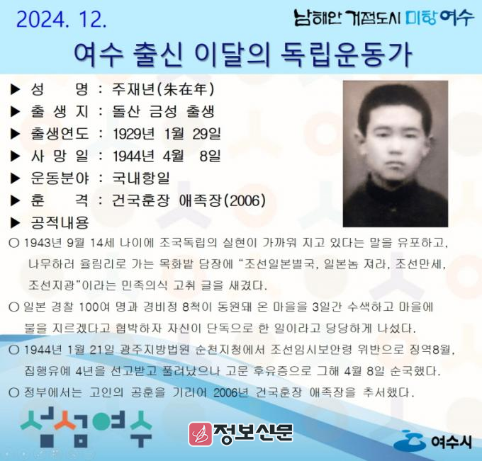 ![]() 여수시(시장 정기명)가 12월의 독립운동가로 돌산 금성 태생 ‘주재년(朱在年) 선생’을 선정했다. |