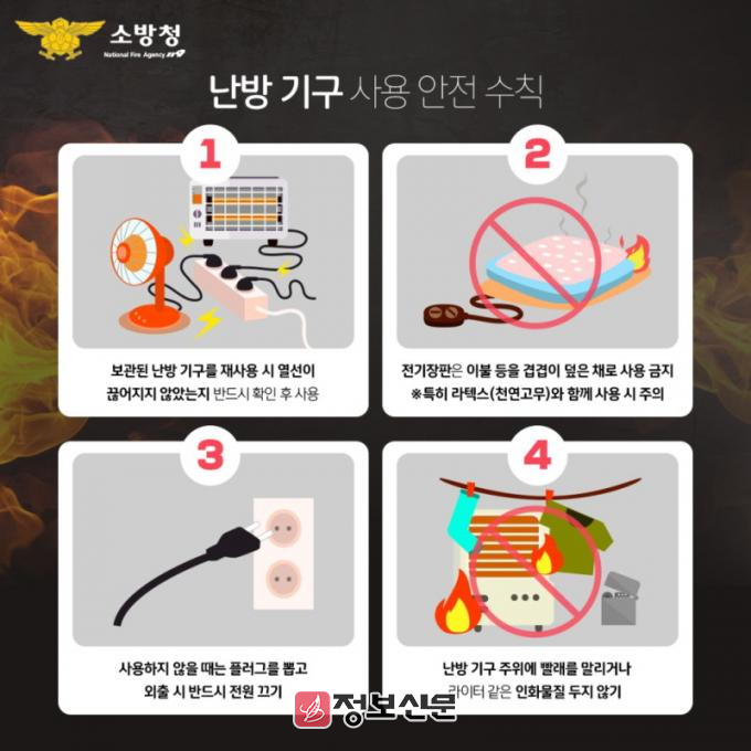 전기 난방용품은 추운 겨울철 보온을 위해 필수이지만 작은 부주의로 인해 큰 화재나 인명피해가 발생할수 있으므로 안전 수칙 준수가 무엇보다 중요하다.