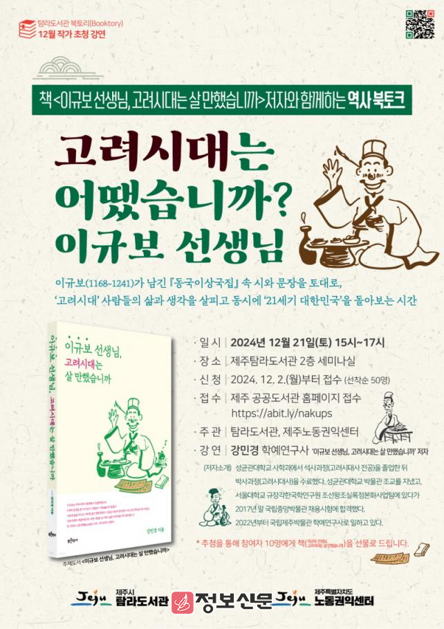 ![]() 탐라도서관, 이규보 선생님, 고려시대는 살 만했습니까 북토크 개최 |