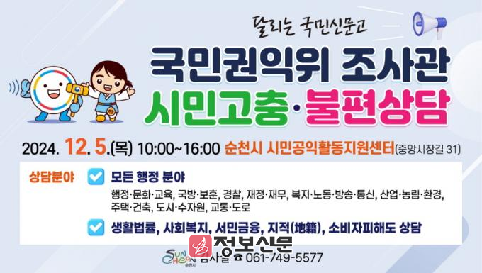 ![]() 순천시, 권익위 조사관 시민고충 불편상담 “달리는 국민신문고” 운영 |