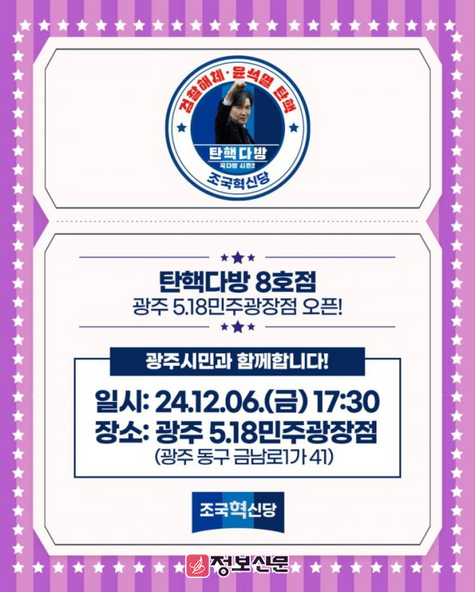 ![]() 조국혁신당광주광역시당, 6일 오후 5.18민주광장에서 ‘탄핵다방 광주점’ 오픈 |