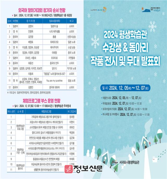 서귀포시 관계자는 “배움을 통해 시민 성장과 행복을 도모해 나가겠다며, 시민들의 평생학습에 많은 관심과 참여를 바란다”라고 말했다.