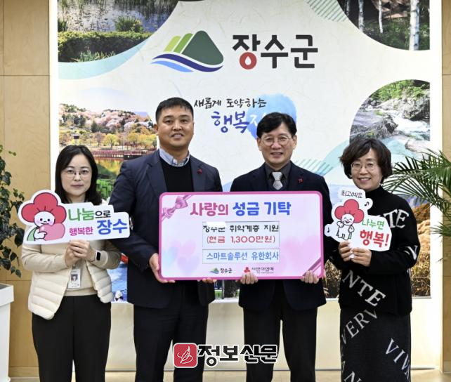 스마트솔루션 유한회사는 매년 설·추석 명절 및 연말연시 성금품 전달을 통해 꾸준히 사랑 나눔을 실천해 오고 있는 기업으로, 올해도 ‘희망2025나눔캠페인’에 장수군 1호 기부자로 성금을 기탁했다.