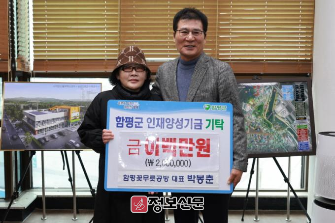 함평군은 4일 함평군 수의사회(회장 박경민)가 1천만 원, 함평꽃무릇공방 박봉춘 대표가 2백만 원을 함평군 인재양성기금에 기탁했다고 밝혔다.