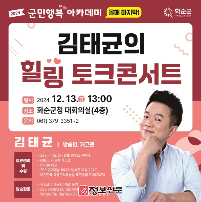 조미화 인구청년정책과장은 “연말에 재미와 감동을 동시에 줄 수 있는 강연을 준비한 만큼 많은 군민이 함께 하길 바란다.”라고 전했다.