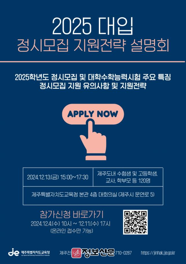 ![]() 제주특별자치도교육청, 2025학년도 대입 정시모집 지원전략 설명회 개최 |