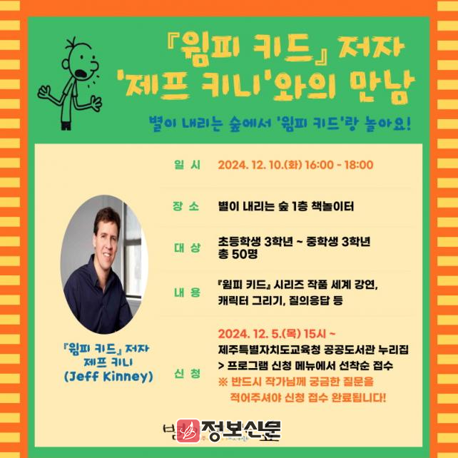![]() 제주도서관, 세계적 베스트셀러 윔피 키드의 제프 키니 만남 참가자 모집 |
