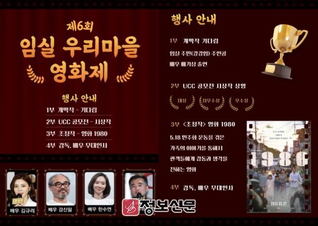 임실군은 오는 9일 개막하는‘제6회 우리마을 영화제’의 초청작인 영화 ‘1980’의 강승용 감독과 배우 김규리와 강신일, 한수연이 함께한다고 밝혔다.