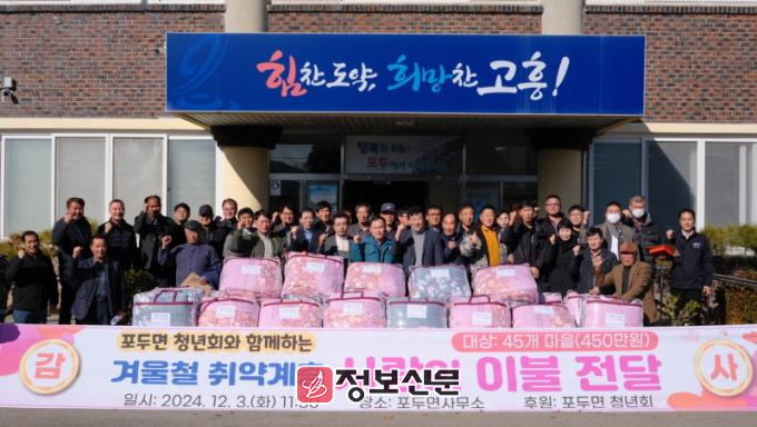 박종팔 포두면장은 “지역사회를 위해 항상 나눔을 실천하는 청년회원들의 사랑과 관심에 깊은 감사를 드리며, 앞으로도 관내 취약계층을 면밀히 살펴 따뜻한 겨울을 보낼 수 있도록 최선을 다하겠다”고 말했다.