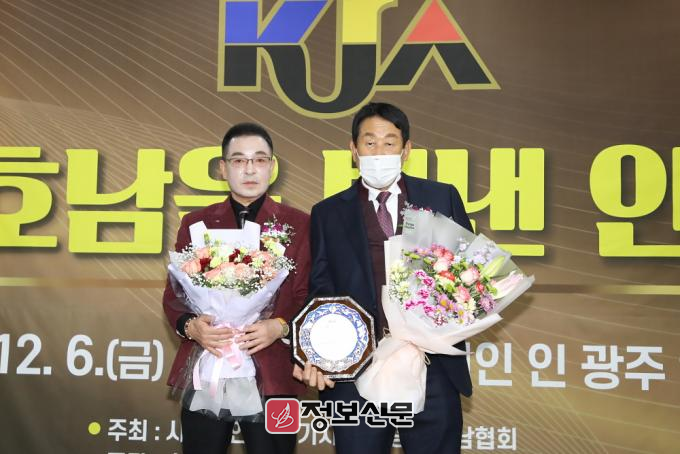 ![]() ▲ 지난 12월 6일 광주 홀리데이 인 광주호텔 2층 연회장에서 열린 ‘2024년 제6회 호남을 빛낸 인물 대상’에서 (사진_우측) 최무진 광주광역시화물자동차운송사업협회 이사장이 경제부문 ‘운송사업혁신’대상을 수상하고 기념촬영을 하고 있다. |