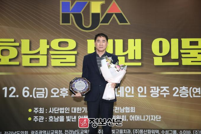 ![]() ▲ 지난 12월 6일 광주 서구 홀리데이 인 광주호텔 2층 연회장에서 열린 ‘2024년 제6회 호남을 빛낸 인물 대상’에서 농수산업부문 ‘농수산업’대상을 수상한 윤재성 해남군청 감사팀장 |
