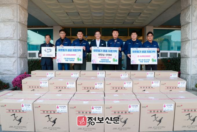 HD현대삼호사내협력사협의회는 500만원 상당의 화장실 안전바 25세트를, (유)현승이엔지(대표 한옥재)는 300만원을, (유)송운사업(대표 한승현)은 400만원을, HD현대삼호반장협의회(회장 이정재)는 300만원 상당의 등유를 각각 기부했다.