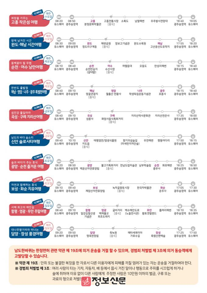 계절별 테마상품과 전남·광주 공동상품, 전남지역 주요 축제와 연계 운영 등 남도의 문화와 자연, 미식을 맛볼 다양한 코스를 9천900원부터 시작하는 착한 가격으로 운영, 큰 호응을 얻고 있다.