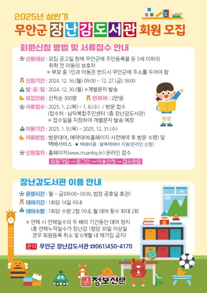 ![]() 무안군, 2025년 장난감도서관 신규회원 300명 모집 |