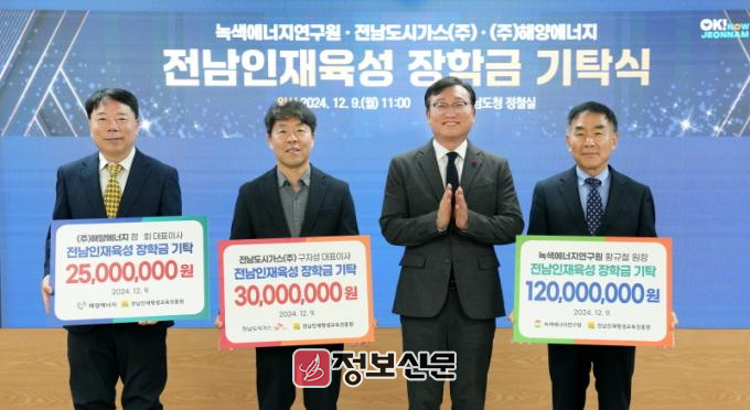 이날 정철실에서 열린 기탁식에는 명창환 전남도 행정부지사, 황규철 녹색에너지연구원장, 구자성 전남도시가스 대표이사, 정회 해양에너지 대표이사, 범희승 전남인재평생교육진흥원장 등이 참석했다.