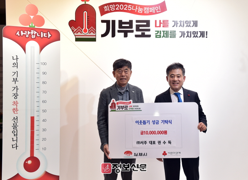 정성주 김제시장은 “모두가 어려운 시기에 꾸준히 나눔을 실천 해주신 ㈜서주우유에 진심으로 감사드린다며, 기탁된 성금은 관내 소외된 이웃들에게 소중히 전달하겠다.”라고 전했다.