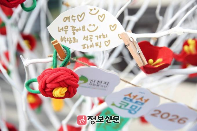 ![]() [사진 제공 = 신천지자원봉사단 여수지부]지난 6일 ‘2026여수세계섬박람회’ 성공개최를 응원하는 시민들의 메시지가 걸린 나무 모습. |