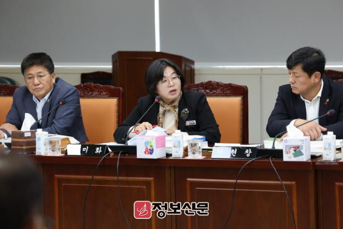 ![]() 전라남도의회 제386회 제2차 정례회 제5차 예산결산특별위원회 회의(5일)에서 오미화 의원이 집행부를 향해 질의하고 있다.