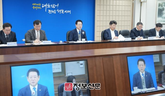 ![]() 김영록 전라남도지사가 10일 오전 도청 서재필실에서 실국장 정책회의를 주재하고 있다. |