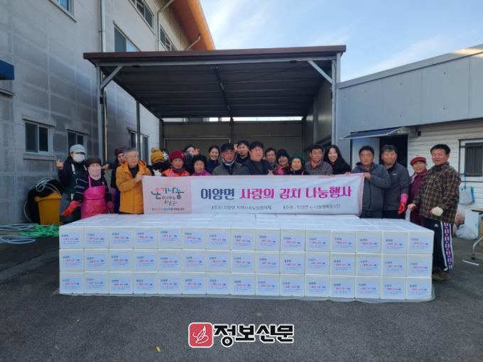 이양 e-나눔 행복봉사단원, 이양면 행정복지센터 직원, 자원봉사자 등 30여 명이 김장 김치 나눔 행사에 참여했고, 김장 김치는 관내 42개소 경로당과 장애인 가구, 어르신 등 이웃 100여 가구에 전달됐다.
