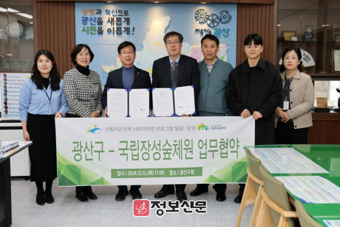 이번 협약은 광산구가 운영 중인 전국 최초 사회적처방 건강관리소와 국립장성숲체원의 산림 치유 프로그램을 연계해 예방적‧사회적 건강 돌봄 체계를 구축한다는 취지로 추진됐다.