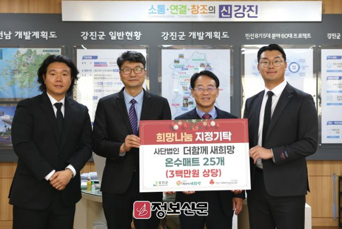 13일 강진군에 따르면 지난 12일 군수실에서 열린 희망2025나눔캠페인 기탁식에서 헤세드 미션콰이어와, 비영리법인 ‘더함께 새희망’이 함께 하며 어려운 이웃을 위한 나눔의 온정을 전했다.