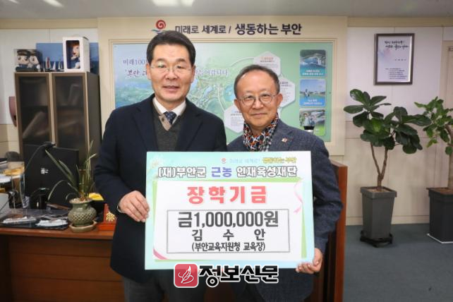 ![]() 김수안 부안교육지원청 교육장, 근농인재육성장학금 100만원 기탁 |
