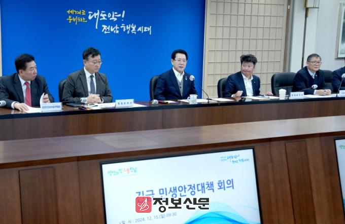 ![]() 김영록 전라남도지사가 15일 오전 도청 서재필실에서 대통령 탄핵소추에 따른 ‘긴급 민생안정대책 회의’를 주재하고 주요 민생사업 신속 집행을 통한 민생경제 활성화를 당부하고 있다. |