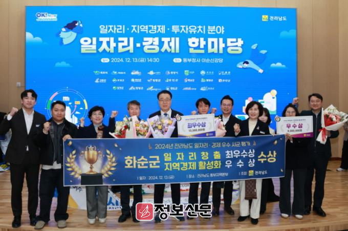 화순군은 지난 13일 전라남도 동부지역본부 이순신강당에서 열린 ‘2024년 일자리·경제 한마당’에서 일자리창출 우수 시군 평가부문 ‘최우수상’을 수상했다.