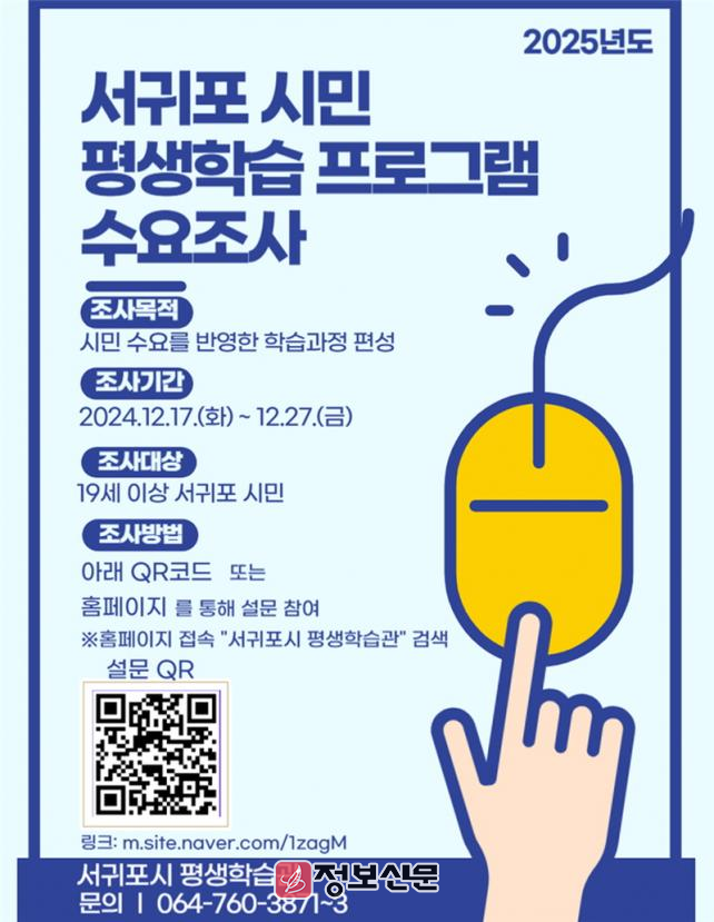 ![]() 서귀포시, 2025년 시민 평생학습 수요 온라인 설문조사 실시 |