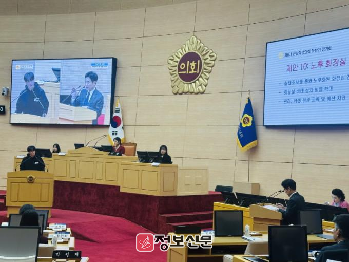 특히 전남조리과학고등학교 이지호 학생이 지역학생연합회를 대표해 제안한 ‘학생 건강권 확보를 위한 화장실 개선’은 제6기 전남학생의회 하반기 권역별 협의회에서 다뤄진 주제로, 본회의장에서 직접 대표 발의할 수 있도록 초대해 의견을 청취했다.