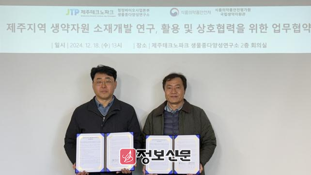 제주테크노파크(원장 문용석, 제주TP)는 18일 제주TP 청정바이오사업본부 생물종다양성연구소 회의실에서 식품의약품안전처 식품의약품안전평가원 국립생약자원관(관장 황진희)와 상호협력 업무협약을 체결했다.